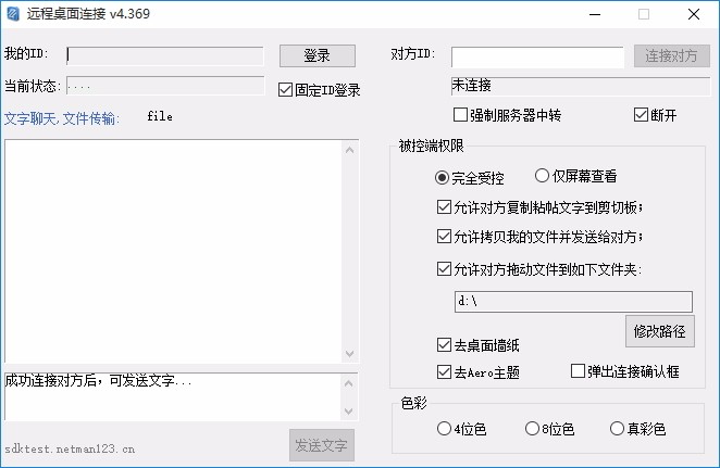 远程桌面连接功能:LookMyPC远程桌面连接软件可以远程遥控鼠标键盘,根据网络环境差异设置不同的屏幕清晰度,提高远程控制的性能和速率(连上对方后,对方桌面会弹出提示窗口,对方应答后,才能成功的建立远程桌面连接)。