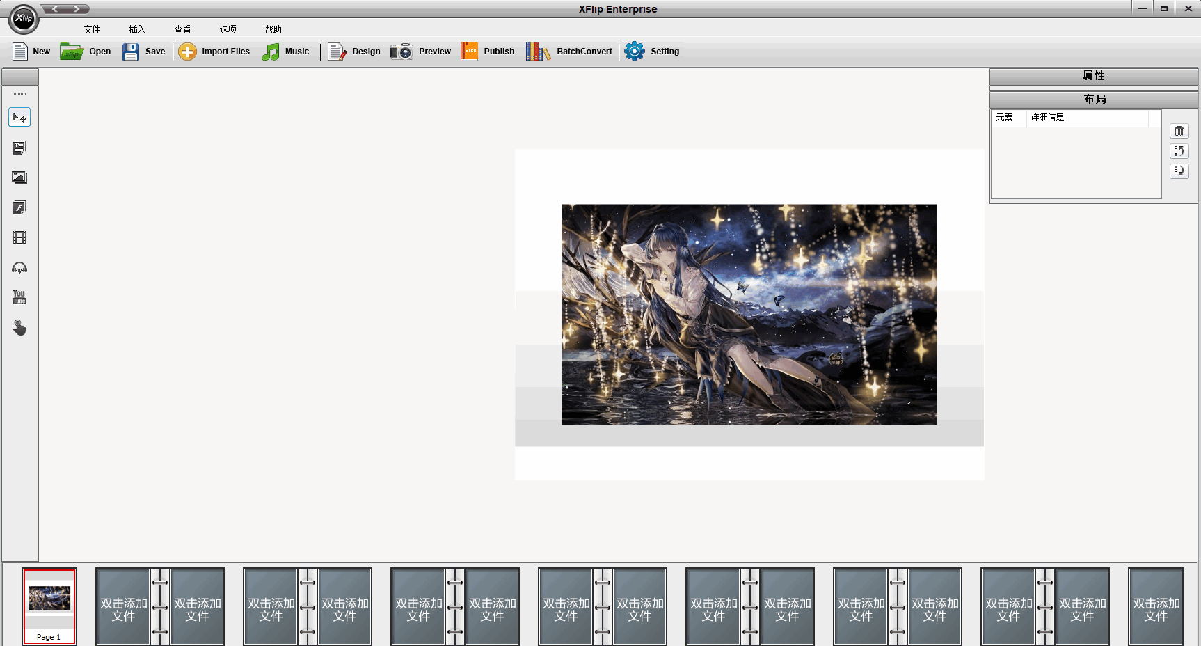 新设计的xflip PRO使用户更加直观。打开翻转软件后,您将看到十个主要按钮:新项目,打开项目,保存,导入文件,添加音乐,设计,预览,发布,批量转换和设置。好吧,一本书的创建非常简单。只需要几个步骤。