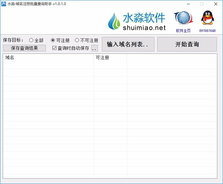水淼域名注册批量查询助手是一款非常简单且实用的域名注册批量查询软件,可帮助用户快速查询域名是否被注册,还可批量进行查询,这样一来您就不用一个一个进行查询了,使用起来非常方便,非常适合站长使用,当您想要知道某个域名是否被注册时,就可以用到这款软件,无需上网搜索域名的注册情况,直接在软件输入域名,选择保存目标,一键即可进行查询,快速且准确的显示出查询结果,可直接了解指定域名对应的注册情况,总之这是一款非常好用的软件,如果您有需要,那就赶快下载体验一下吧!