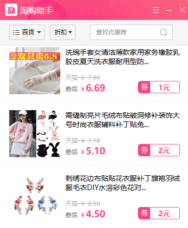 淘购助手是电脑版的商品优惠券查找工具,用户通过这款工具可以查找到许多优惠商品;不少商品都可以通过软件查找到优惠券,通常使用优惠券购买东西会比较便宜,每件商品的优化价格是一元到几十元不等,其中可优惠5元左右的商品数量比较多,对于经常购物的用户来说,一件商品可以优惠5元,一年下来还是可以为用户节省不少钱的;淘购助手直接安装在计算机上启动即可使用,这款工具的用户界面简洁直观,可以直接使用关键字搜索您需要查看的商品;需要的小伙伴欢迎下载体验。