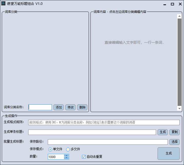 德望万能标题组合工具是一款便捷好用的随机标题批量生成工具,该工具对网站站主来说十分有用;用户在为网站进行关键词组合的时候是非常麻烦的,因为简单的几个关键词相互组合就有几十种组合方式,如果依靠人力对关键词进行组合,那将非常耗费时间;这款德望万能标题组合工具的使用方式很简单,只需要创建几个关键词库,然后编辑对应词库下的内容,设置生成词库的规则,再按照用户需要设置生成的文件类型,生成的数量就可以一键批量生成,短短几秒钟的时间就可以完成人力几个小时的工作。