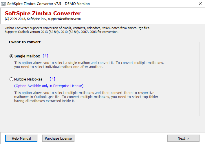 步骤1:启动软件,一次转换多个邮箱,选择“多个邮箱”选项,然后单击“下一步”按钮,如下所示: