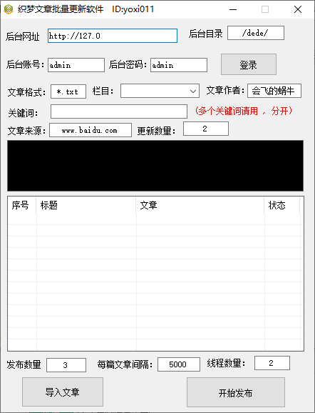 织梦文章批量更新软件是一款由易语言发开的文章批量更新工具,该工具的界面简洁,操作简单,适用于网站站主批量的更新网站内容;不少站长会在更新网站文章的时候花费大量的时间,特别对于需要更新大量文章的站长来说,手动更细无疑是最低效的选择;推荐的这款织梦文章批量更新软件采用常规的网站文章更新模板,用户可以批量添加文本文件和HTML文件来进行文章自动更新;软件简单好用,提升了站长的发文效率,是一款不错的批量文章发布工具;需要的朋友欢迎下载。