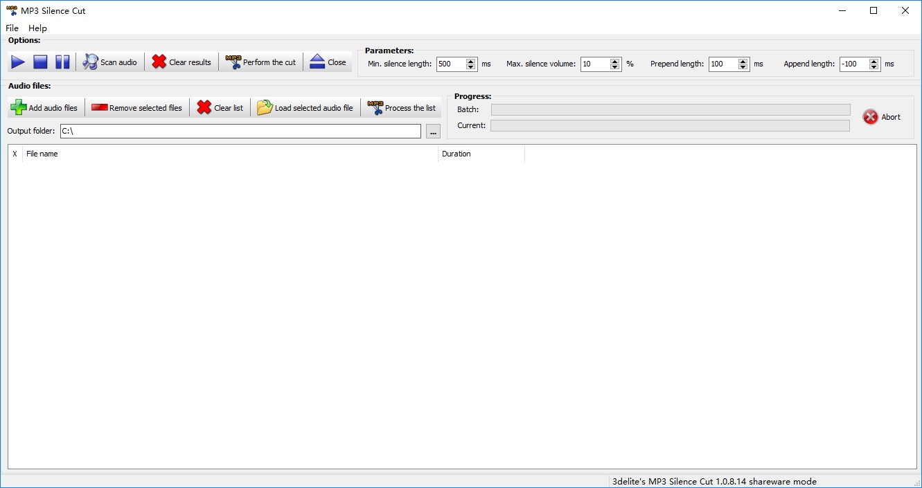 MP3 Silence Cut 可以同时管理多个文件。不支持在其接口中拖放文件,但您可以通过单击第二工具栏中的专用按钮轻松地将MP3添加到列表中。您可能无法导入整个文件夹。