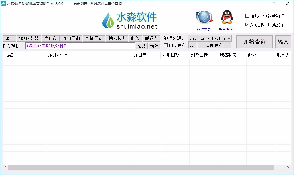 水淼域名DNS批量查询助手是一款非常专业且优秀的域名DNS批量查询软件,通过这款软件,可帮助用户快速将域名DNS进行查询,还可批量进行查询,这样您就不用一个一个进行查询了,使用起来非常方便,软件操作也非常简单,只需输入需要查询的域名,选择数据来源,一键即可进行查询,快速且准确的显示出查询结果,可将这些查询到的结果进行保存,还可设置保存模板,以指定的模板保存查询数据,总而言之这是一款非常好用的软件,如果您有需要,那就赶快下载体验一下吧!