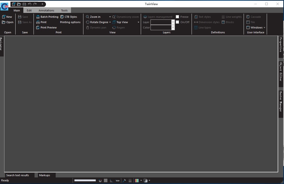 TwinView Edit是一款功能强大、专业实用的CAD创建编辑软件,同时也是一款强大专业的CAD绘图浏览软件,是一种基于Windows的CAD图纸编辑和查看工具,可以帮助用户快速便捷的进行CAD文件编辑和快速打开CAD绘图文件进行浏览,可以说是一款多功能CAD文件查看编辑器软件;TwinView Edit可以帮助用户打开各种格式的CAD图纸文件,可以使用软件上的CAD绘图工具对图纸进行编辑,同时该软件支持CAD图纸打印和CAD图纸打印预览等多种功能,可以对多种光栅和矢量格式在内的CAD图纸进行查看、编辑和打印。