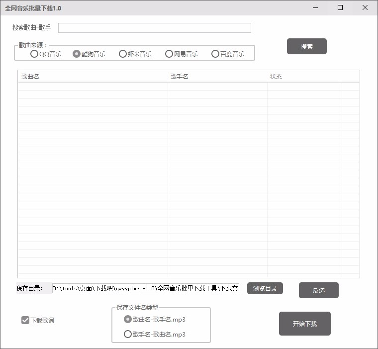 全网音乐批量下载是一款非常简单且实用的音乐下载软件,顾名思义,通过这款软件,可帮助用户快速将全网音乐进行下载,有的时候,在某些网站听歌时,遇到自己喜欢的歌曲,想要下载到本地免费进行播放,但是很多网站上的歌曲都需要付费才能进行下载,小编特地推荐这款软件,完全免费,可下载全网的音乐,包括不同类型的音乐,在下载音乐的同时,还可下载歌词,每个歌曲文件都对应一个歌词文件,使用起来非常方便,总之这是一款非常好用的软件,如果您有需要,那就赶快下载体验一下吧!