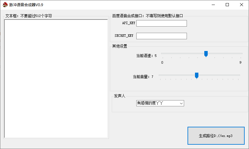 脉冲语音合成器是一款文字转语音工具,该工具使用百度转换引擎,可以将文字转换成mp3保存;这款工具看上去很简洁,事实也是如此,因此它的操作也十分简单,对于用户而言,使用这款工具并不需要任何技术;脉冲语音合成器采用的是百度端口,它允许用户使用自己申请的端口进行连接,如果没有百度端口的用户也不必担心,因为您可以直接使用软件默认端口进行转换;脉冲语音合成器拥有四种音效,分别有提供两男两女的音效,用户可以根据场景选择使用有感情或者是无感情的音效使用。