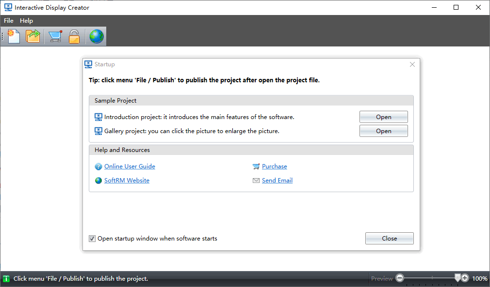 Interactive Display Creator是一款强大的媒体显示软件,该软件可以用来显示多种文件,比如图片,视频,文本以及PDF文档等等;通过强大的控制功能,用户可以轻松创建出具有丰富媒体文件的交互式显示系统;在学校,展览馆或者医院等人流量大的地方,通过创建交互式媒体显示有助于吸引用户观看宣传资料,以此提升品牌的知名度;Interactive Display Creator是一件简单又强大的功能,它兼容很多文件格式,可以轻松显示文件内容,适用于很多领域,需要的小伙伴可以下载了解。