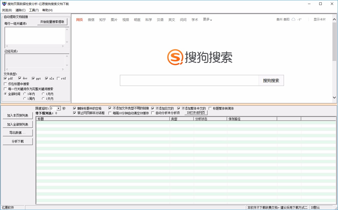 亿愿搜狗搜索文档下载,网络上存在大量的免费的pdf、ppt、xls、doc、rtf 等文档文件下载,我们可以利用各种搜索引擎很方便快捷智能化的找到它们并且下载回来,【亿愿搜狗搜索文档下载】专业下载搜狗文档搜索引擎搜索到的pdf,ppt,xls,doc,rtf 等文档文件。不下载百度文库等收费的文档。 软件可以批量搜索关键词,可以仅搜索标题,可以搜索指定天数内的数据,可以自动分析未分析项,自动下载文件,软件只需输入批量关键词,设置好了以后,全自动分析提取下载文档。软件支持二次过滤,以免下载不需要的文档。