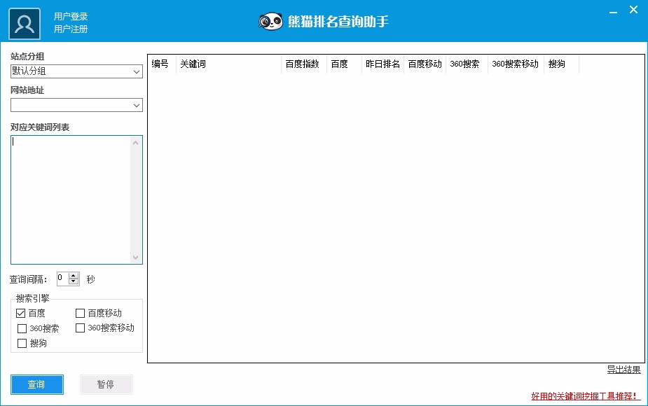 软件目前已经完美支持百度,搜狗,360搜索的关键词排名查询,同时支持排名记录导出为Excel文档和历史趋势。