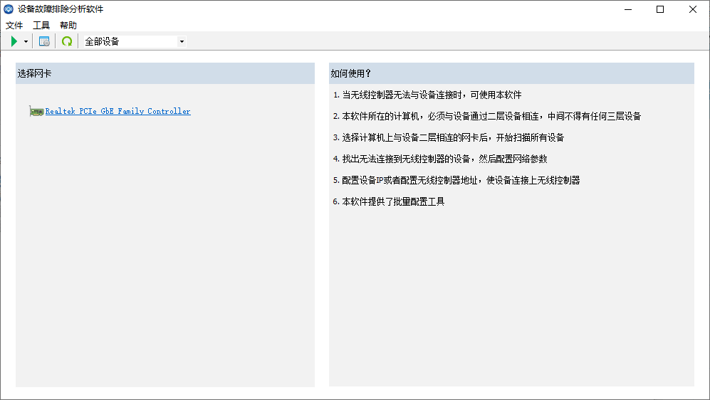 设备故障排除分析软件是一款用于修复设备AP的网络诊断工具,它能够帮助用户在NAC控制器中诊断设备,并为用户提供了批量配置设备的能力;AP是用来组建小型无线局域网的设备,AP连接异常意味着用户无法使用无线网传输文件,如果出现局域网无法正常使用时,用户可以通过该工具检测AP设备,查看AP中所有连接的设备信息,通过设备信息查看,让用户能够通过批量配置的方式从新配置设备;这款工具简单好用,对于网络运营人员来说是一个十分高效的工具,需要的用户欢迎下载使用。