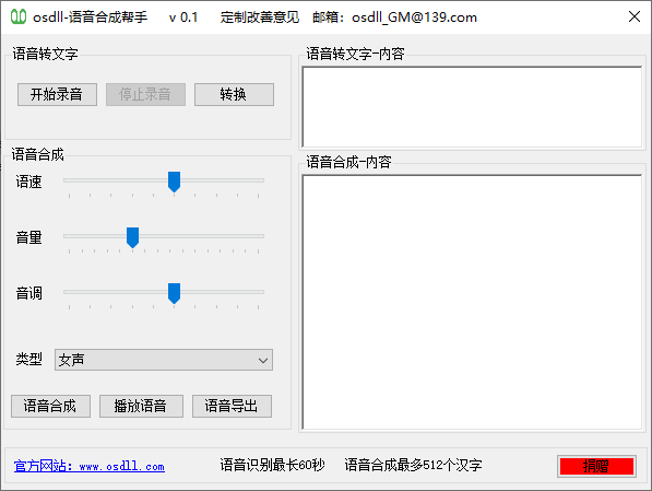 osdll语音合成帮手是一款好用的语音转换和生成工具,它可以将用户的录音转换成文字,同时也可以将文字转换成语音;这款工具的界面十分简洁,所有功能都能够一眼俱全,所以无论是对于任何经验的用户都是友好的,毕竟用户在使用这款工具的时候无需在如何使用上花费过多的时间;osdll语音合成帮手在很多领域都可以得到很好的使用,比如视频字幕配音,广告语制作,语音祝福语等等;该工具默认会将合成的语音输出为mp3格式,以确保用户在其它设备和软件中都可以正常的播放音频。