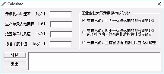 Calculate是一款非常简单且实用的大气污染防护距离计算器,通过这款软件,可帮助用户快速计算污染物无组织排放源所在的生产单元卫生防护距离,软件体积小巧,所占内存也很小,但是功能却很实用,且软件操作非常简单,只需输入计算所需数据,通过一两个简单的步骤,一键即可进行计算,内置精准的计算算法,快速且准确的显示出计算结果,使用起来非常方便,即便您是新手,也能轻松得到计算结果,总而言之这是一款非常好用的软件,如果您有需要,那就赶快下载体验一下吧!