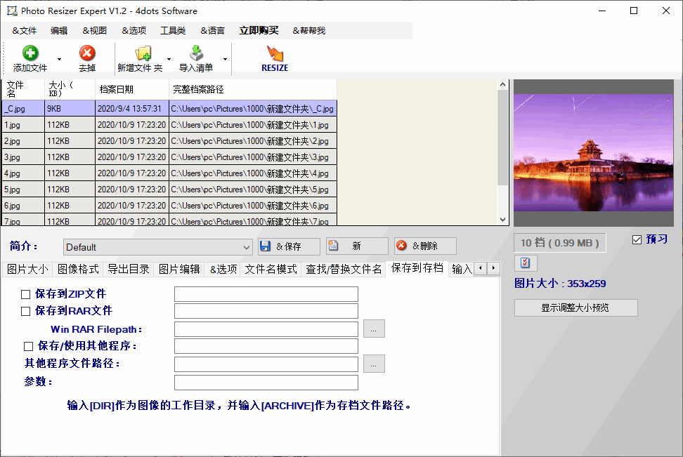8、拥有压缩图片,图像格式,导出目录,图片编辑,选项,文件名模式,查找/替换文件名,保存到存档等功能。
