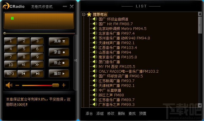 龙卷风网络收音机是一款非常出名的网络电台收听软件,随着宽带网的普及,网速越来越快,网上听广播已不成问题。使用龙卷风收音机,只用鼠标轻轻一点,就能让您听遍全世界的声音。龙卷风网络收音机 (CRadio)是一款可以收听全球各地网络电台的软件,也可以用于收看在线网络电视节目,还可以播放本地媒体文件(如MP3,RM,WMA等多格式文 件)。龙卷风收音机具有操作简单、强大的数据管理、在线更新电台数据等特点。内建有共有上千个电台,包括500多个中文电台(包括国语、粤语)和美国、英国、日本、 法国、德国、新加坡、加拿大、韩国等其他国家的一些国际著名电台。龙卷内置了自动在线更新数据及程序功能,以最快速度获取新数据。为广大广播爱好者、外语学 习者及音乐爱好者提供很大的方便新版本收集多个的网络电视,可在线收看电视节目。