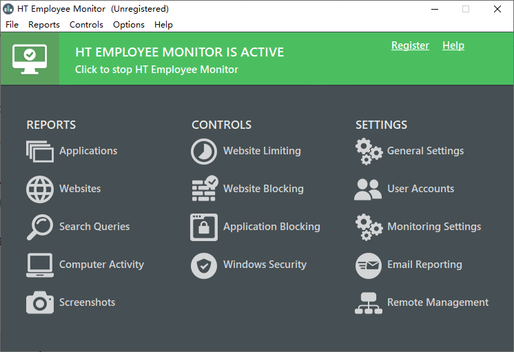 HT Employee Monitor是一款功能强大的计算机监控管理软件,该软件的主要功能是为用户提供一个便捷计算机监控管理解决方案,通过它实现对计算机使用的限制和监视;这款软件比较灵活,用户可以按需自定义配置相关的应用,游戏以及网站等,使用户在指定的时间内无法使用这些软件;HT Employee Monitor可以用来管理员工或者是孩子,它支持监控报告发送,可以实时截取桌面图像,并在指定的时间将截图发送给用户,让用户可以直观的查看当前电脑的使用情况;用户可以为软件设置保护密码,防止软件的参数被修改。