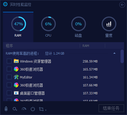 实时性能监控是一个小巧简洁的计算机性能监控软件,这款工具类似于计算机的资源管理器,用户能够通过这款工具获取计算机目前的运行状态和管理应用进程等;这款工具主要可以监测计算机的内存使用,CPU使用,磁盘使用和量度等数据;当计算机运行卡顿或者应用运行异常的时候,用户就可以通过这款工具将一些不需要使用的进程关闭,还可以通过一键释放计算机内存等方式来恢复计算机;实时性能监控工具是一个单文件工具,即开即用非常的方便,需要的用户欢迎下载体验。
