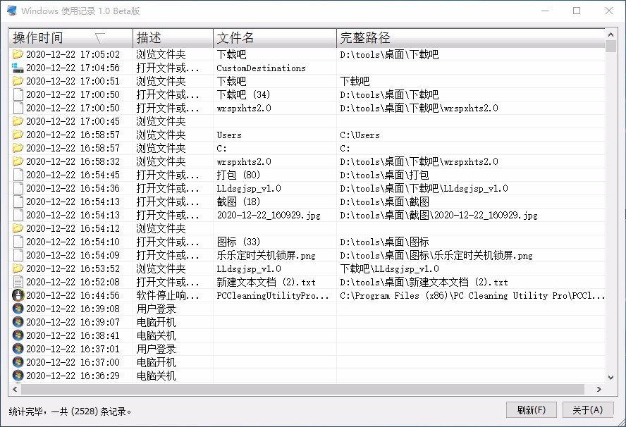 Windows使用记录查看工具是一款非常简单且实用的Windows使用记录查看软件,通过这款软件,可帮助用户快速查看Windows使用记录,不仅可以查看最近使用的一些记录,还可查看从第一次使用Windows系统到现在使用的记录,包括开机、软件安装等记录,所有记录信息集中显示在软件界面,便于您更加直观的进行查看,详细了解具体的记录信息,使用起来非常方便,打开软件即可进行查看,操作非常简单,总而言之这是一款非常好用的软件,如果您有需要,那就赶快下载体验一下吧!