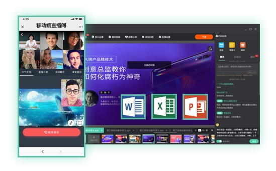 支持音视频、各类课件、图文等素材支持桌面分享、软件直播等模式。