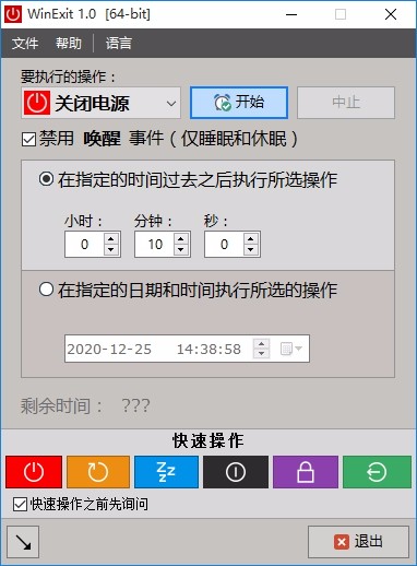 WinExit是一款非常简单且实用的电脑自动开关机工具,通过这款软件,可帮助用户快速将电脑自动进行开关机,有的时候,在下班或离开电脑前,可能需要电脑继续执行某些下载任务,这时候就可以用到这款软件,只需选择要执行的操作,如关闭电源,设置定时关机时间,一键即可按照指定设置执行任务,无需看守,即可让电脑在指定的时间自动进行关机,使用起来非常方便,软件提供了不同的界面语言,可选择自己喜欢的语言进行设置,总之这是一款非常好用的软件,如果您有需要,那就赶快下载体验一下吧!