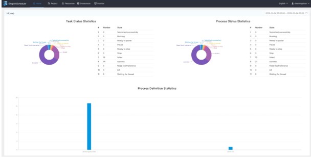 主页包含所有用户项目的任务状态统计信息,过程状态统计信息和工作流定义统计信息。