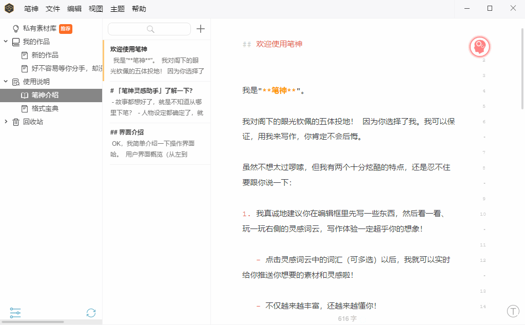 笔神是一款强大的写作辅助软件,它能够为用户智能化的文章创作解决方案,它采用智能人工技术,通过分析用户所创作的内容,为用户提供精美的文案素材,以此辅助用户提升写作效率;用户还可以在这款软件上创建私有素材库,件用户平时积累的文案素材集中的进行管理保存,在写作的时候也可以快速的调出使用;笔神能够为用户提供的海量写作素材包含了小说,诗词,作文等等方面的文案,让用户的文章质量得到进一步的提升;这款工具还支持一键排版等功能,可以快速对用户的文章进行排版美化;这款工具可以让初入门的用户更好的进行文章创作。