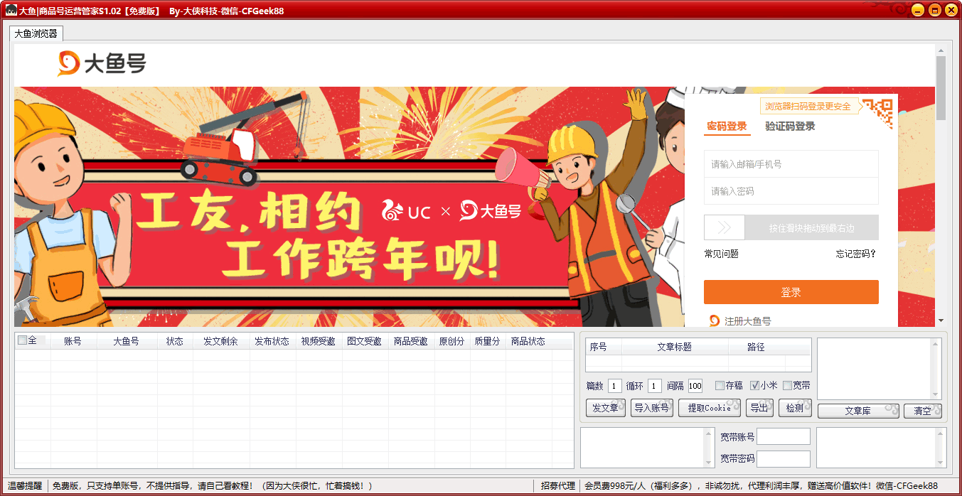 2、打开之后使用自己的账号登录大鱼号,免费版只支持单账号运行。