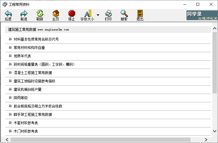 工程常用资料工具是一个用于建筑数据资料查询的小工具,这款工具本身没有特别多的功能,它的主要作用是为用户提供部分工程常用数据的查询和打印;通过这款工具用户可以轻松查看材料基本性质常用的名称和代码,常用材料和构件自重以及地质年代表等等数据信息;工程常用资料工具就像是一个公式表,在用户不确定建筑数据的情况下提供一个便捷的数据查询功能;这款工具中包含的都是一些比较常用的数据资料,您可以选择对您有用的资料打印出来;需要的小伙伴欢迎下载使用。