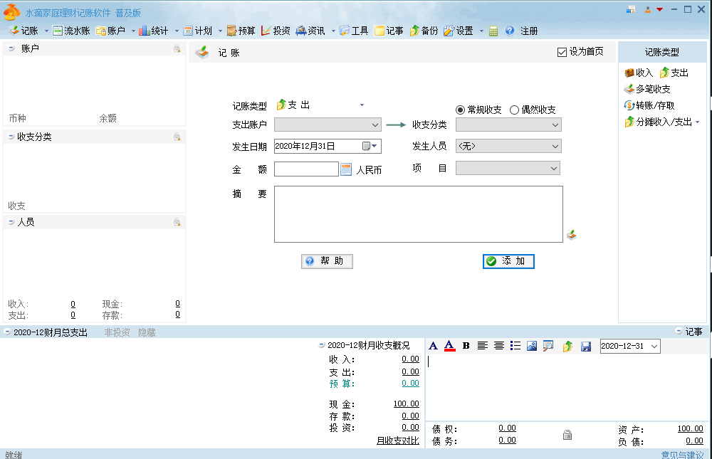 5、下图是流水账的记录界面,可以在左侧的管理窗口中选择对应分类打开新建记账。