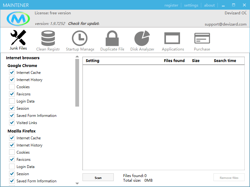 Maintener是用于清理计算机系统垃圾数据的系统优化软件,通过这款软件,用户可以很轻松的清理计算机中无用的注册表信息以及其它一些无用的网络数和系统文件,通过这种方式释放更多的磁盘空间;这款软件的功能十分强大,它还可以帮助用户查找计算机中重复文件,分析磁盘,卸载程序等等;计算机每天都会产生很多的垃圾数据,如果不及时清理,这些数据会占用计算机很多的内存,而通过Maintener的清理,只需要花费几分钟的时间就可以轻松将系统中的各种垃圾数据全部清除,使计算机运行更加流畅。