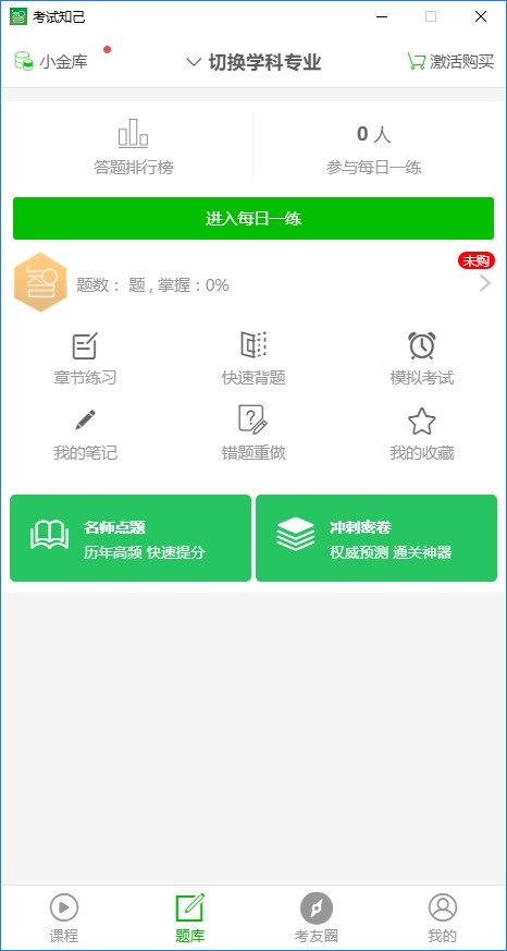 4、进入考试题库界面,该界面可以进行考试章节练习和笔记记录