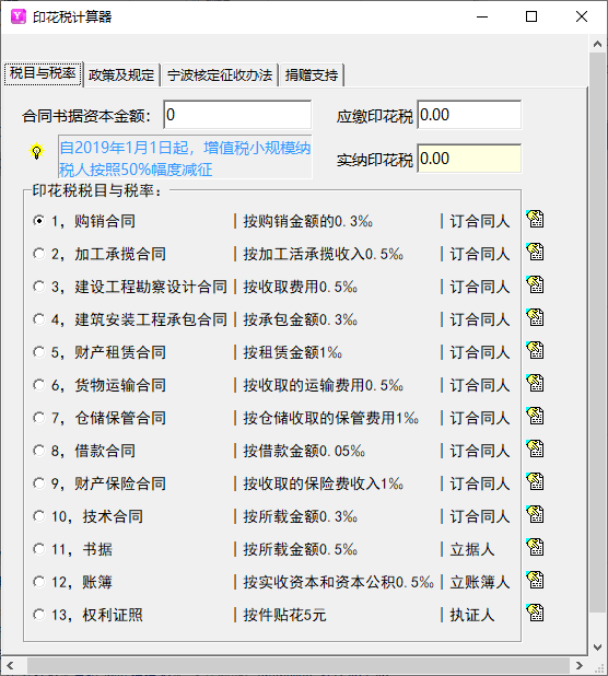 印花税计算器,顾名思义就是一款用于计算印花税的小工具,企业在签订合同的时候就会涉及到印花税的计算,如果对印花税的计算方式不是很了解的话,可能会给企业带来一些麻烦;但毕竟很多企业的负责人并不是专业的会计出身,因此对于各种税率的算法并不是太清楚;这款印花税计算器结合了宁波的印花税政策以及最新的一些印花税规定而制定;它可以帮助一些小企业快速计算出印花税的费用,这款过这款印花税计算器的界面整洁直观,所有的计算方式都集中在一个界面中,用户可以很轻松地进行印花税计算;需要的用户欢迎下载使用。