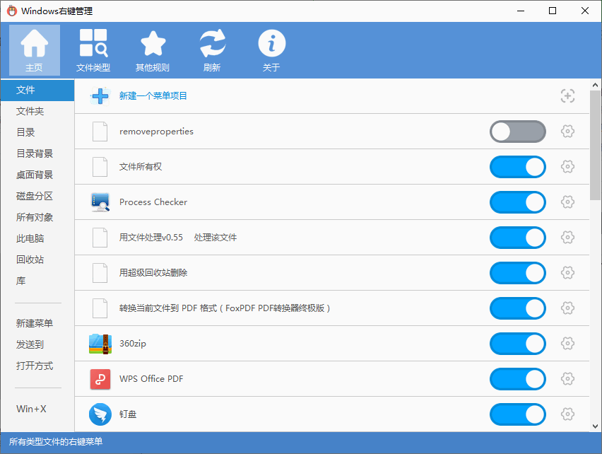 1、启用或禁用文件、文件夹、新建、发送到、打开方式、自定义文件格式等右键菜单项目。