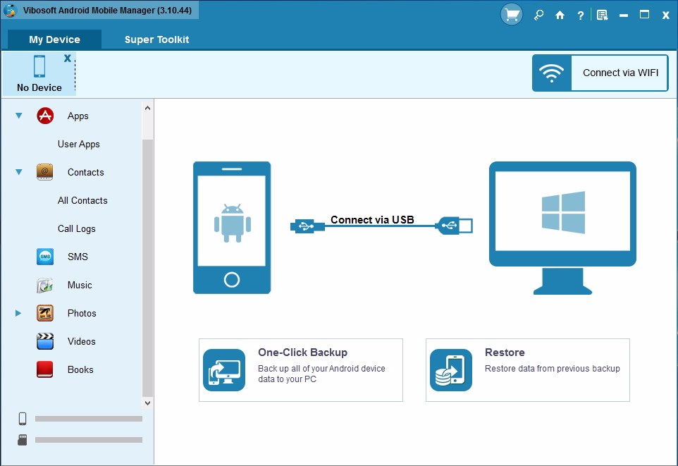为了确保Android设备数据的安全,最有效的解决方案是在计算机上复制您的宝贵数据。要将您的Android数据作为Windows资源管理器进行管理,意外的方法是通过计算机上的USB电缆控制Android手机。现在,Vibosoft Android Mobile Manager为您提供了足够的能力来管理和控制您计算机上Android设备上的所有内容,而没有任何限制。