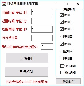 钉钉日报周报提醒工具是一款非常简单且实用的钉钉通知提醒软件,通过这款软件,可帮助用户快速将钉钉通知进行提醒,具备简洁直观的操作界面,旨在为用户提供最简单的操作,只需设置提醒时间、提醒间隔等选项,选择需要通知的星期,一键即可开始通知,可在指定时间进行钉钉日报周报提醒,避免您忘记查看钉钉日报周报信息,有了它,您就再也不用担心忘记查看日报周报了,使用起来非常方便,总而言之这是一款非常好用的软件,如果您有需要,那就赶快下载体验一下吧!