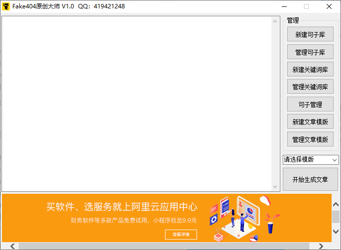 Fake404原创大师是一款很实用的原创文章生成工具,这款软件可以通过用户添加的句子,关键词以及模板等快速生成原创文章;相比较其它原创文章生成工具,这款软件生成的原创文章更有可读性,用户需要自行查找句子素材和设置关键词,还需要自己创建文章模板,完成所有创建之后就可以一键快速生成原创文章了;Fake404原创大师在使用方式遵从简单便捷的设计思想,所有功能都集中在软件的右侧面板中,直接选择对应的功能打开就可以根据提示进行操作和管理;需要的用户可以下载体验。