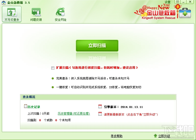 金山急救箱是一款永久免费的木马查杀软件,可快速诊断系统是否中毒,强力查杀顽固和未知木马。并能将系统和上网环境恢复如初。金山急救箱采用全新的云安全技术,不会与任何杀毒软件冲突,是装机的必备安全软件。