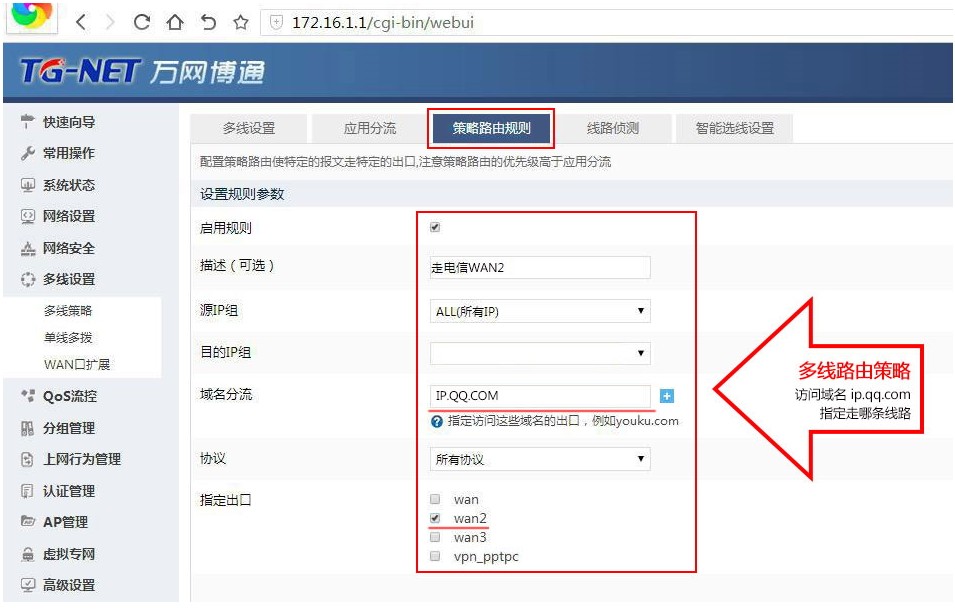 4、点击策略路由规则按钮,可以配置策略路由使特定的报文走特定的出口注意策略路由的优先级高于应用分流