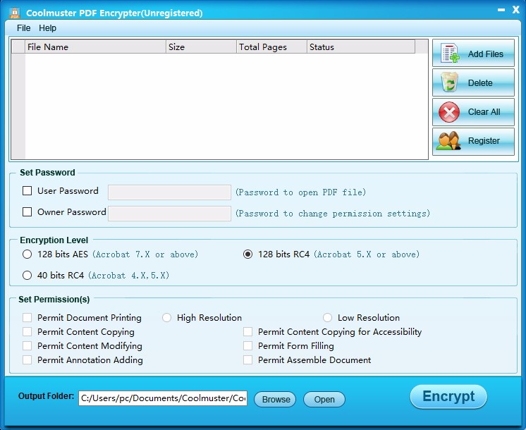 使用Coolmuster PDF Encrypter,您可以设置用户密码,所有者密码,并为不同版本的Acrobat选择加密级别为128位AES,128位RC4或40位RC4。最后,您可以为PDF设置打印,应对,修改以及注释添加,表单填写和组装的权限。