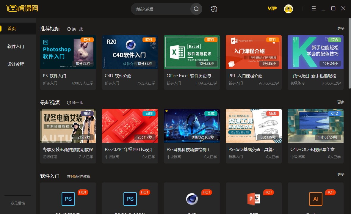 虎课网客户端是一款非常优秀专业的在线视频课程学习软件,是由财牛教育科技有限公司最新推出的一款案例式短视频设计教学软件,该软件为用户提供PS、AI、CAD、AE、Sketch 、Motion、字体设计、海报设计等多种相关类型的教学视频,可以帮助用户快速便捷的熟练使用各种软件;通过虎课网客户端这款视频学习软件,用户可以查找各种软件使用的在线视频教程,可以让用户边看边学,快速了解各种软件的使用方法,且该软件支持窗口置顶、学习历史记录查看等多种功能,非常方便实用,有需要的用户可以下载进行使用。