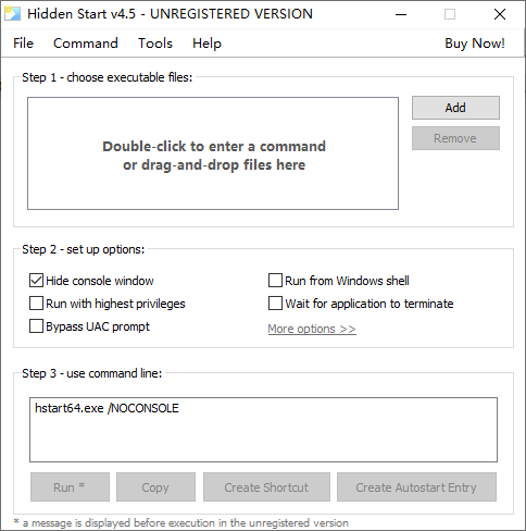 Hidden Start是一款非常强大的命令行工具,这款工具可以帮助我们在任何没有后台窗口的情况下使用命令行运行程序或者是批处理文件;这款软件拥有自动生成命令行的能力,比如用户只需要添加一个可执行文件,然后选择需要执行的设置即可生成提示符,用户可以直接运行它,也可以将其复制到粘贴板中使用,甚至还能够将命令行生成桌面快捷方式,当需要进行对应操作的时候,直接运行的它就可以启用;Hidden Start的使用方式简单便捷,需要的用户欢迎到本站下载使用。