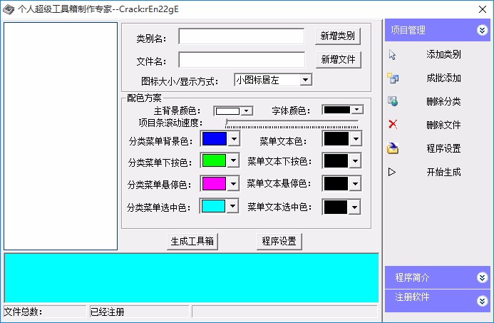 个人超级工具箱制作专家是一款非常简单且实用的工具箱制作软件,顾名思义,通过这款软件,可帮助用户快速将工具箱进行制作,使用该软件,您可以将平时常用或者觉得好用的软件添加到制作的工具箱中,将多个软件集中进行管理,便于快速查找和使用需要的软件,对于不同类型的软件,可添加对应的类别,将相应的软件添加至指定位置,将这些软件进行了分类,有序进行显示,为了将软件区分开来,还可对其分类菜单颜色进行设置,使用起来非常方便,欢迎有需要的用户下载体验