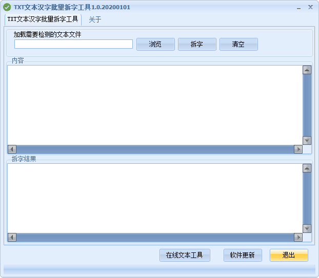TXT文本汉字批量拆字工具是一款体积轻巧、方便实用的汉字拆分软件,该软件可以帮助用户将汉字拆分成多个组成部分,在古代人们通过拆分汉字进行汉字分析,判断汉字名称吉凶情况,对于拆分汉字有兴趣的用户来说,使用这款软件可以帮助您轻松快速的进行汉字拆分;TXT文本汉字批量拆字工具界面简单、操作容易,易学易用,对于有需要的用户来说是一款非常不错的汉字拆分软件,用户只需复制粘贴汉字或者将本地文本汉字内容导入软件即可进行汉字拆分,整个操作步骤非常简单快速,有兴趣的朋友可以下载试试。