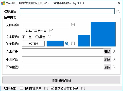Win10开始菜单美化小工具是一款非常简单且实用的系统美化软件,通过这款软件,可帮助用户快速将系统进行美化,具备简洁直观的操作界面,旨在为用户提供最简单的操作,只需选择需要的程序,进行简单设置,通过几个简单的步骤一键即可添加或更新磁贴,即便您是新手,也能在短时间内快速掌握具体的操作方法,轻轻松松美化系统,软件提供调色板,可对程序背景、文字颜色进行设置,可随时更换颜色,使用起来非常方便,总之这是一款非常好用的软件,如果您有需要,那就赶快下载体验一下吧!
