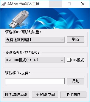 AMpe fba写入工具是一款非常简单且实用的fba写入软件,通过这款软件,可帮助用户快速将fba进行写入,软件体积小巧,所占内存也很小,但是功能却很实用,操作也非常简单,只需选择USB可移动磁盘以及要制作的模式,然后添加fba文件,一键即可制作USB启动盘,使用起来非常方便,即便您是新手,也能在短时间内快速掌握具体的操作方法,轻轻松松对USB启动盘进行制作,除此之外,还支持还原U盘空间,总而言之这是一款非常好用的软件,如果您有需要,那就赶快下载体验一下吧!