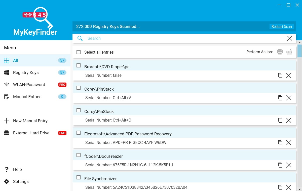 Abelssoft MyKeyFinder是一款密钥查找工具,它可以帮助我们查找计算机中保存的各种程序密钥以及WiFi密码等,是一个不错的密码查找工具;在购买一些大型软件时用户会获取一个软件密钥,用户必须使用密钥注册软件才可以打开软件使用,通常情况下,密钥是很容易丢失的,如果密钥丢失之后,用户就的无法重新安装软件或者是在其它电脑上安装软件使用;Abelssoft MyKeyFinder可以对计算机的注册文件进行扫描,并将所有的密钥数据都直观的展示在列表中,用户可以一键复制密钥使用,如果您忘记了您的WiFi密码,只要您的电脑连接过您需要找回密码的WiFi,您也可以通过它查找您的WiFi密码。