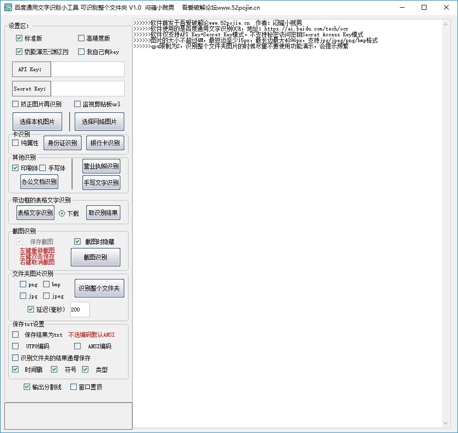百度通用文字识别小工具是一款体积轻量、简单便捷的OCR图文识别软件,该软件会自动生成config.ini文件来保存用户的一些配置,让用户可以进行简单便捷的图文识别,该软件支持选择本地图片、网络图片进行识别,可以进行身份证、银行卡等纯属性识别,还可以对办公文档、营业执照、手写文字等进行识别,使用这款软件用户只需将图片添加到软件上或者将直接对其屏幕进行截屏即可进行图片识别;百度通用文字识别支持TXT设置、支持一键批量识别功能,可以对选择的文件夹内的图片进行一键批量识别,非常方便实用。