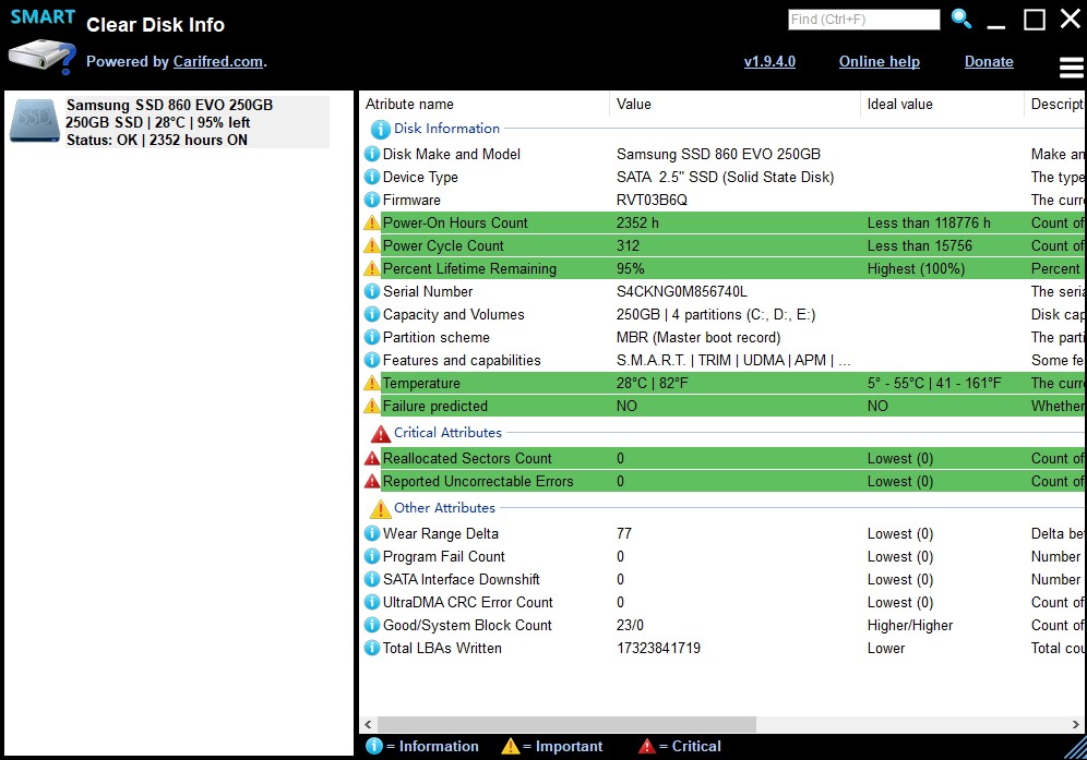 第一组名为磁盘信息,显示了一些最重要的运行状况属性,例如开机小时数,温度和剩余寿命百分比(对于SSD)。该组还显示设备信息,例如型号,序列号和旋转速率(用于HDD),磁盘分区以及一些其他有用的信息。