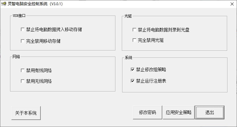 灵智电脑安全控制系统是一个简单小巧的文件管理系统,使用这款软件可以限制一些系统功能,比如您可以限制网络的使用,USB存储器的使用以及光驱和系统设置的使用等等;想要从计算机上拷贝文件数据,最常用的两种方式是直接拷贝到其它存储器中,另一种是通过网络传输,因此用户只需要限制网络使用以及USB的使用,其他人就无法从计算机中拷贝任何文件了;灵智电脑安全控制系统对于大部分用户来说是很有帮助的,它还可以限制系统组的使用,可避免系统组被人恶意修改或者是误修改。